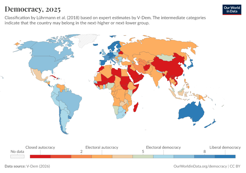 “Data Page: Political regime”, part of the following publication: Bastian Herre, Lucas Rodés-Guirao, and Esteban Ortiz-Ospina (2013) - “Democracy”. Data adapted from V-Dem. Retrieved from https://region-dods-income-groups.owid.pages.dev/grapher/political-regime-amb-row [online resource]How to cite this data