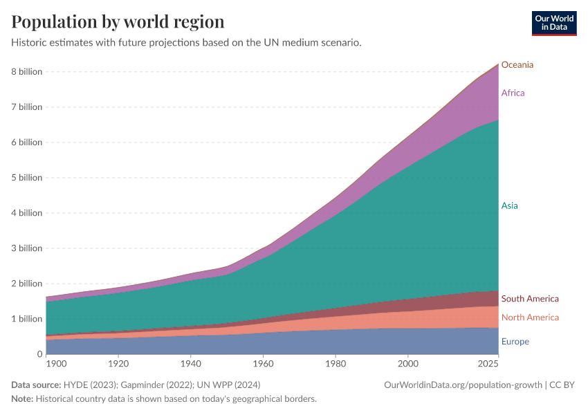 “Data Page: Population by world region”, part of the following publication: Hannah Ritchie, Lucas Rodés-Guirao, Edouard Mathieu, Marcel Gerber, Esteban Ortiz-Ospina, Joe Hasell, and Max Roser (2023) - “Population Growth”. Data adapted from PBL Netherlands Environmental Assessment Agency, Gapminder, United Nations. Retrieved from https://region-dods-income-groups.owid.pages.dev/grapher/population-regions-with-projections [online resource]How to cite this data