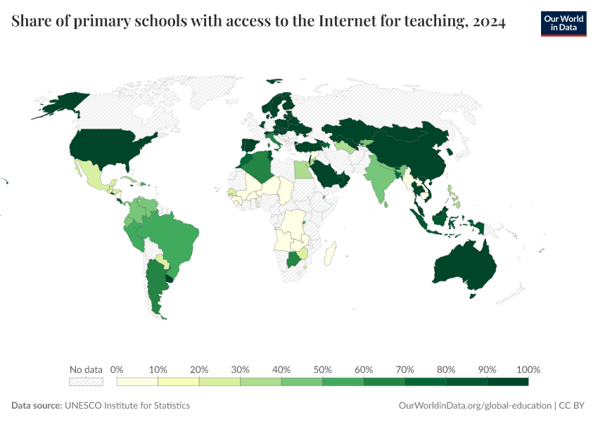 “Data Page: Share of primary schools with access to the Internet for teaching”. Our World in Data (2026). Data adapted from UNESCO Institute for Statistics. Retrieved from https://region-dods-income-groups.owid.pages.dev/grapher/primary-schools-with-access-to-internet [online resource]How to cite this data