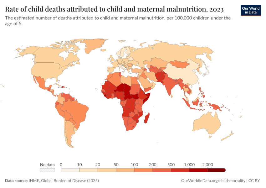 “Data Page: Rate of child deaths attributed to child and maternal malnutrition”, part of the following publication: Esteban Ortiz-Ospina and Max Roser (2016) - “Global Health”. Data adapted from IHME, Global Burden of Disease. Retrieved from https://region-dods-income-groups.owid.pages.dev/grapher/rate-of-child-deaths-attributed-to-child-and-maternal-malnutrition [online resource]How to cite this data