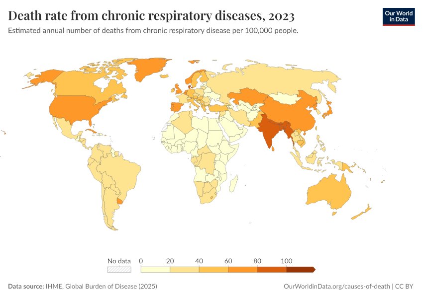 “Data Page: Death rate from chronic respiratory diseases”, part of the following publication: Esteban Ortiz-Ospina and Max Roser (2016) - “Global Health”. Data adapted from IHME, Global Burden of Disease. Retrieved from https://region-dods-income-groups.owid.pages.dev/grapher/respiratory-disease-death-rate-gbd [online resource]How to cite this data
