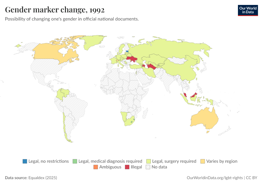 “Data Page: Gender marker change”, part of the following publication: Bastian Herre and Pablo Arriagada (2023) - “LGBT+ Rights”. Data adapted from Equaldex. Retrieved from https://region-dods-income-groups.owid.pages.dev/grapher/right-to-change-legal-gender-equaldex [online resource]How to cite this data