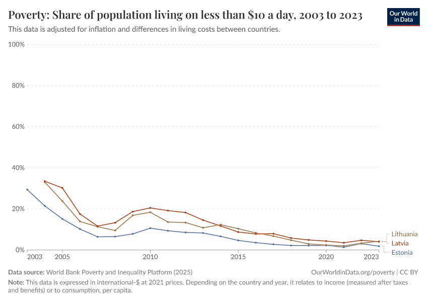 “Data Page: Poverty: Share of population living on less than $10 a day”, part of the following publication: Joe Hasell, Bertha Rohenkohl, Pablo Arriagada, Esteban Ortiz-Ospina, and Max Roser (2022) - “Poverty”. Data adapted from World Bank Poverty and Inequality Platform. Retrieved from https://region-dods-income-groups.owid.pages.dev/grapher/share-living-with-less-than-10-int--per-day [online resource]How to cite this data