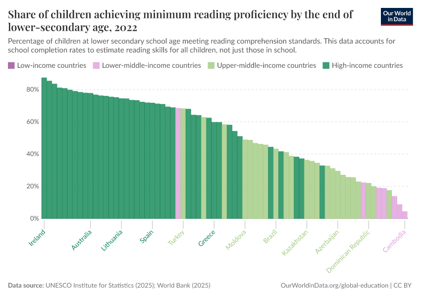 “Data Page: Share of children achieving minimum reading proficiency by the end of lower secondary age”, part of the following publication: Hannah Ritchie, Veronika Samborska, Esteban Ortiz-Ospina, and Max Roser (2023) - “Global Education”. Data adapted from UNESCO Institute for Statistics. Retrieved from https://region-dods-income-groups.owid.pages.dev/grapher/share-of-children-reaching-sufficient-reading-comprehension-by-the-end-of-lower-secondary-age [online resource]How to cite this data