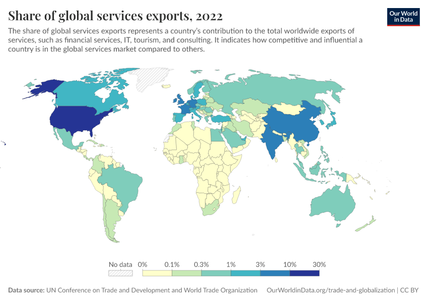 “Data Page: Share of global services exports”. Our World in Data (2026). Data adapted from UN Conference on Trade and Development and World Trade Organization. Retrieved from https://region-dods-income-groups.owid.pages.dev/grapher/share-of-global-services-exports [online resource]How to cite this data