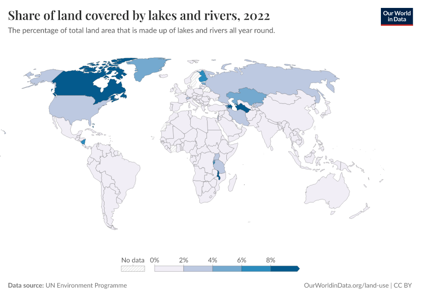 “Data Page: Share of land covered by lakes and rivers”. Our World in Data (2026). Data adapted from UN Environment Programme. Retrieved from https://region-dods-income-groups.owid.pages.dev/grapher/share-of-land-covered-by-lakes-and-rivers [online resource]How to cite this data