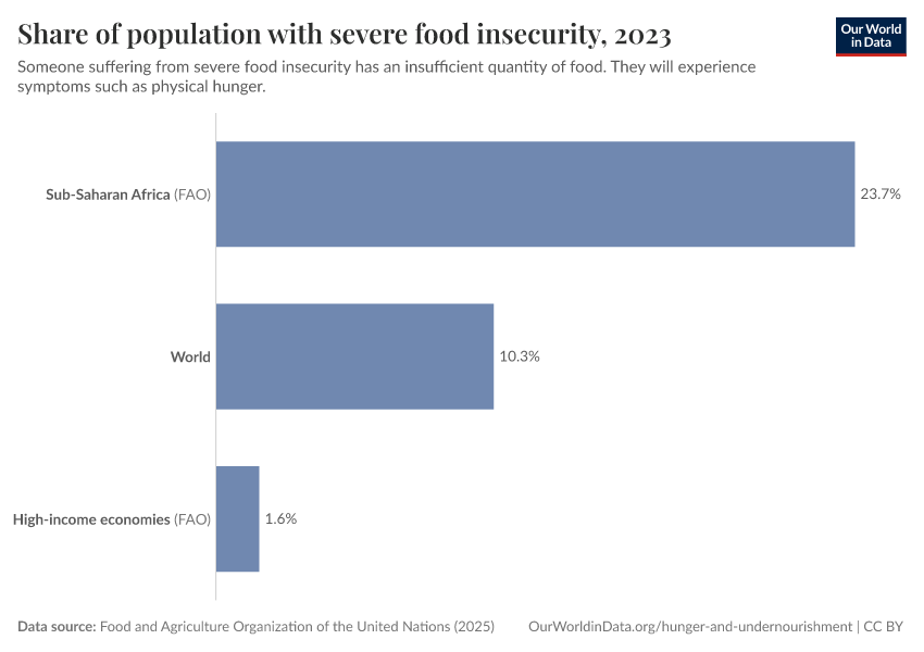 “Data Page: Prevalence of severe food insecurity in the total population”, part of the following publication: Hannah Ritchie, Pablo Rosado, and Max Roser (2023) - “Agricultural Production”. Data adapted from Food and Agriculture Organization of the United Nations. Retrieved from https://region-dods-income-groups.owid.pages.dev/grapher/share-of-population-with-severe-food-insecurity [online resource]How to cite this data