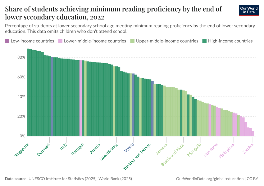 “Data Page: Share of students achieving minimum reading proficiency by the end of lower secondary education”, part of the following publication: Hannah Ritchie, Veronika Samborska, Esteban Ortiz-Ospina, and Max Roser (2023) - “Global Education”. Data adapted from UNESCO Institute for Statistics. Retrieved from https://region-dods-income-groups.owid.pages.dev/grapher/share-of-students-at-end-of-lower-secondary-education-with-minimum-reading-proficiency [online resource]How to cite this data