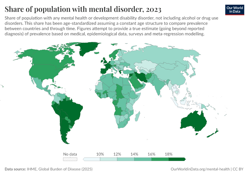 “Data Page: Share of population with mental disorder”, part of the following publication: Saloni Dattani, Lucas Rodés-Guirao, Hannah Ritchie, and Max Roser (2023) - “Mental Health”. Data adapted from IHME, Global Burden of Disease. Retrieved from https://region-dods-income-groups.owid.pages.dev/grapher/share-with-mental-health-or-development-disorder [online resource]How to cite this data