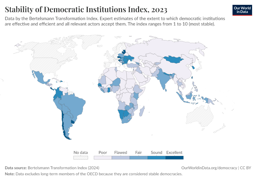 “Data Page: Stability of Democratic Institutions Index”, part of the following publication: Bastian Herre, Lucas Rodés-Guirao, and Esteban Ortiz-Ospina (2013) - “Democracy”. Data adapted from Bertelsmann Transformation Index. Retrieved from https://region-dods-income-groups.owid.pages.dev/grapher/stability-democratic-institutions-index-bti [online resource]How to cite this data