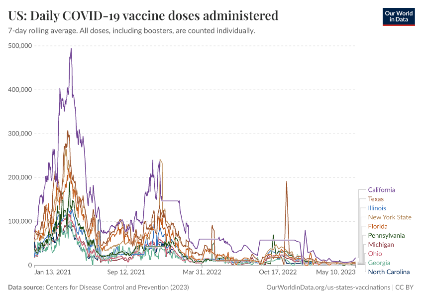 “Data Page: US: Daily COVID-19 vaccine doses administered”, part of the following publication: Edouard Mathieu, Hannah Ritchie, Lucas Rodés-Guirao, Cameron Appel, Daniel Gavrilov, Charlie Giattino, Joe Hasell, Bobbie Macdonald, Saloni Dattani, Diana Beltekian, Esteban Ortiz-Ospina, and Max Roser (2020) - “COVID-19 Pandemic”. Data adapted from Centers for Disease Control and Prevention. Retrieved from https://region-dods-income-groups.owid.pages.dev/grapher/us-daily-covid-vaccine-doses-administered [online resource]How to cite this data