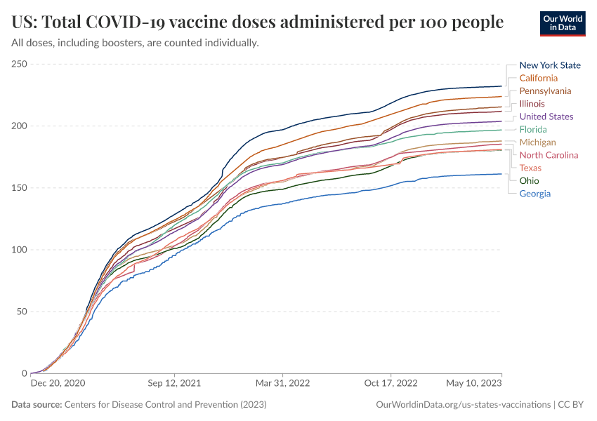 “Data Page: US: Total COVID-19 vaccine doses administered per 100 people”, part of the following publication: Edouard Mathieu, Hannah Ritchie, Lucas Rodés-Guirao, Cameron Appel, Daniel Gavrilov, Charlie Giattino, Joe Hasell, Bobbie Macdonald, Saloni Dattani, Diana Beltekian, Esteban Ortiz-Ospina, and Max Roser (2020) - “COVID-19 Pandemic”. Data adapted from Centers for Disease Control and Prevention. Retrieved from https://region-dods-income-groups.owid.pages.dev/grapher/us-state-covid-vaccines-per-100 [online resource]How to cite this data
