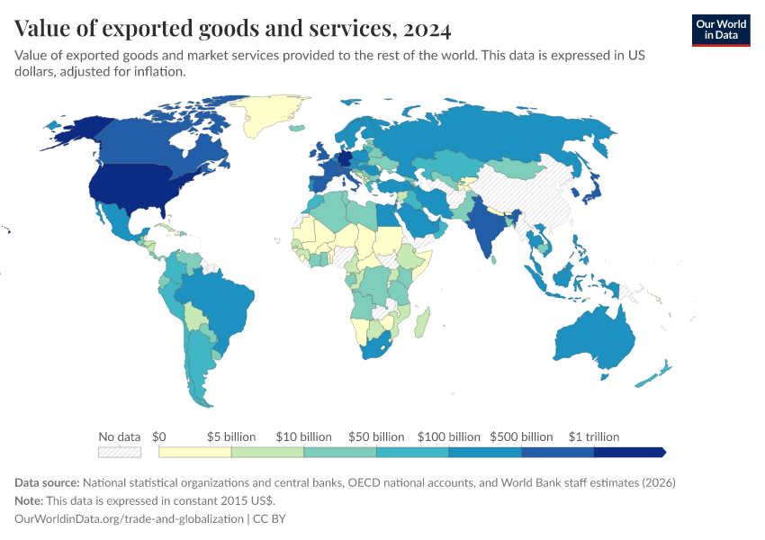 “Data Page: Value of exported goods and services”. Our World in Data (2026). Data adapted from National statistical organizations and central banks, OECD national accounts, and World Bank staff estimates. Retrieved from https://region-dods-income-groups.owid.pages.dev/grapher/value-of-exported-goods-and-services [online resource]How to cite this data