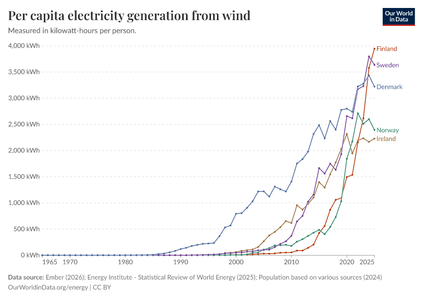 Ember (2026); Energy Institute - Statistical Review of World Energy (2025); Population based on various sources (2024) – with major processing by Our World in Data. “Electricity generation from wind power per person” [dataset]. Ember, “Yearly Electricity Data Europe”; Ember, “Yearly Electricity Data”; Energy Institute, “Statistical Review of World Energy”; Various sources, “Population” [original data]. Retrieved February 26, 2026 from https://region-dods-income-groups.owid.pages.dev/grapher/wind-electricity-per-capita