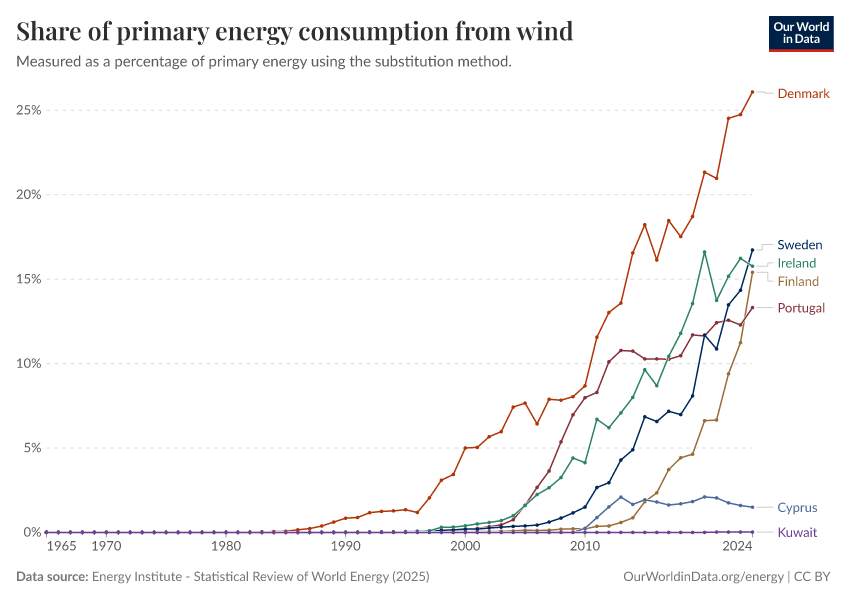 Energy Institute - Statistical Review of World Energy (2025) – with major processing by Our World in Data. “Share of primary energy consumption that comes from wind power – Using the substitution method” [dataset]. Energy Institute, “Statistical Review of World Energy” [original data]. Retrieved February 26, 2026 from https://region-dods-income-groups.owid.pages.dev/grapher/wind-share-energy