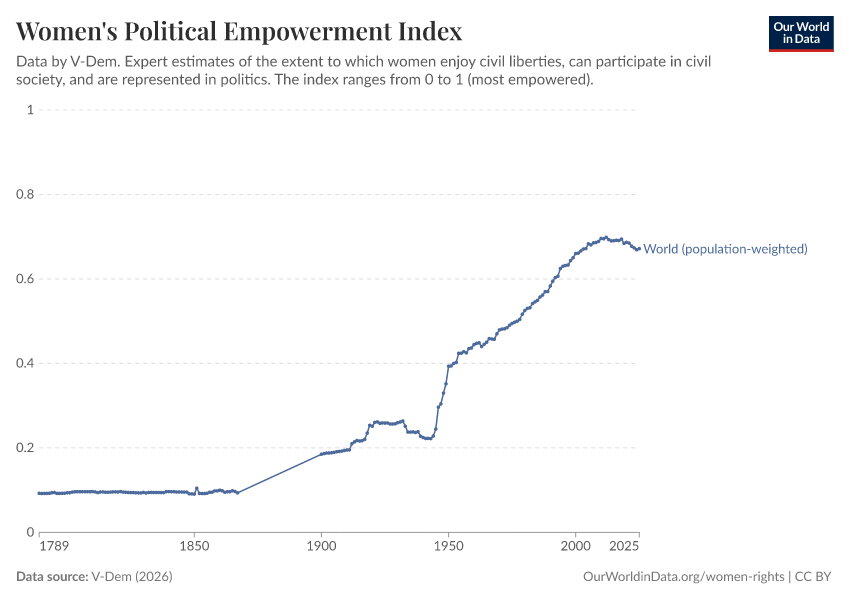 “Data Page: Women's political empowerment index”, part of the following publication: Bastian Herre, Lucas Rodés-Guirao, and Esteban Ortiz-Ospina (2013) - “Democracy”. Data adapted from V-Dem. Retrieved from https://region-dods-income-groups.owid.pages.dev/grapher/women-political-empowerment-index [online resource]How to cite this data