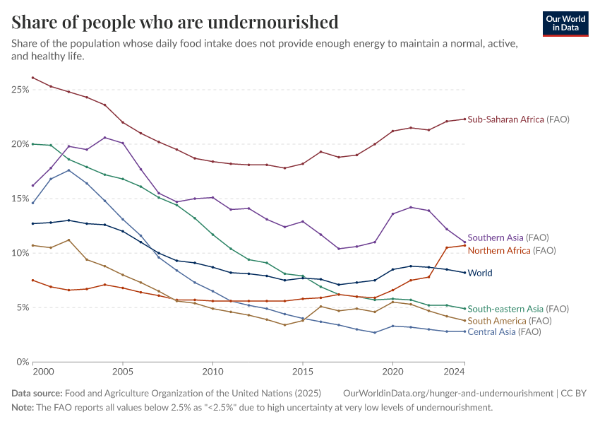 Hannah Ritchie, Pablo Rosado, and Max Roser (2023) - “Hunger and Undernourishment” Published online at OurWorldinData.org. Retrieved from: 'https://region-dods-income-groups.owid.pages.dev/hunger-and-undernourishment' [Online Resource]BibTeX citation