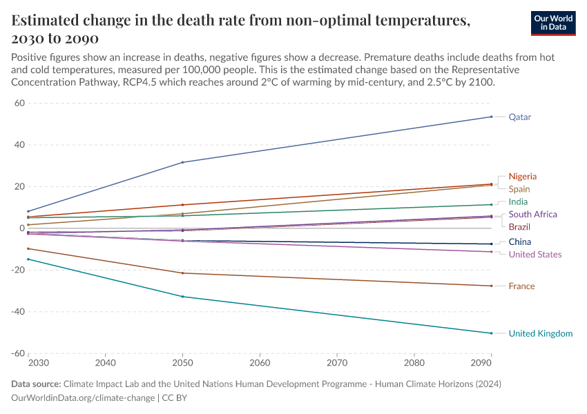 There are some countries where any increase in temperature is expected to increase temperature-related deaths; the death rate in places like Nigeria, Bangladesh, and Qatar will be higher in 2030 and continue to go up with every 0.5°C of warming. The opposite is true for other countries. The chart shows in the United Kingdom, Sweden, and Canada, warming is expected to reduce temperature-related deaths.
