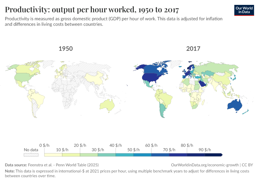 As our interactive chart shows, this historical achievement is underpinned by productivity growth: in many countries, workers produce much higher output per hour today than in 1950.