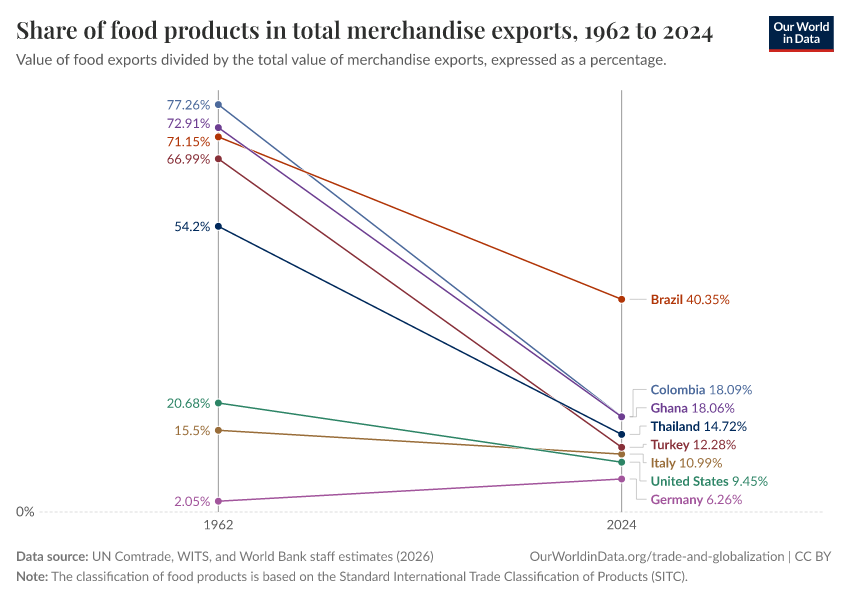 The chart shows two broad trends. First, in most countries, food has become a smaller share of merchandise exports relative to the 1960s. There are some exceptions (for example, Germany’s share is slightly higher today than it was then), but the dominant pattern across countries is a decline. You can explore the interactive chart to see the trajectories for other countries, or select the Map view for a full overview across all countries for any given year.