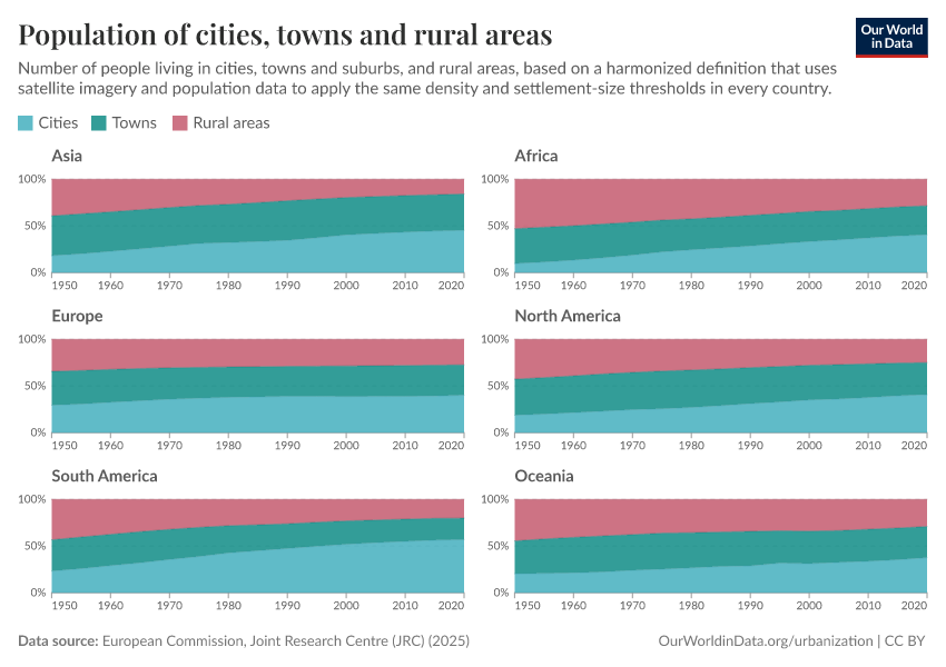 However, the manual on how to apply the Degree of Urbanization recommends reporting figures across three distinct categories—cities, towns, and villages—rather than using a simple urban-rural dichotomy. This approach recognizes urbanization as a continuum, acknowledging that towns occupy a unique position, differing significantly from both cities and villages in their characteristics and needs. The reported cities, and towns population shares by continent are shown in the chart below.