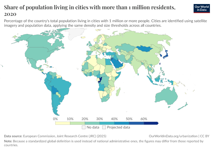 Although the definition of 'urban' gives us some indication of population densities, it does not differentiate between those who live in small versus large urban settings. In the chart, we show the percentage of the total population that lives in agglomerations greater than one million people (i.e. large urban agglomerations). These figures are available in absolute terms (the total number of people living in large urban settings), found here.