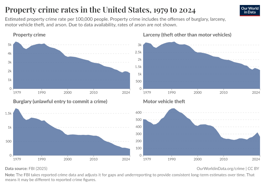 Again, the chart below looks at trends for different types of property crime.6 Larceny and burglary have mirrored the steady decline since the 1990s.