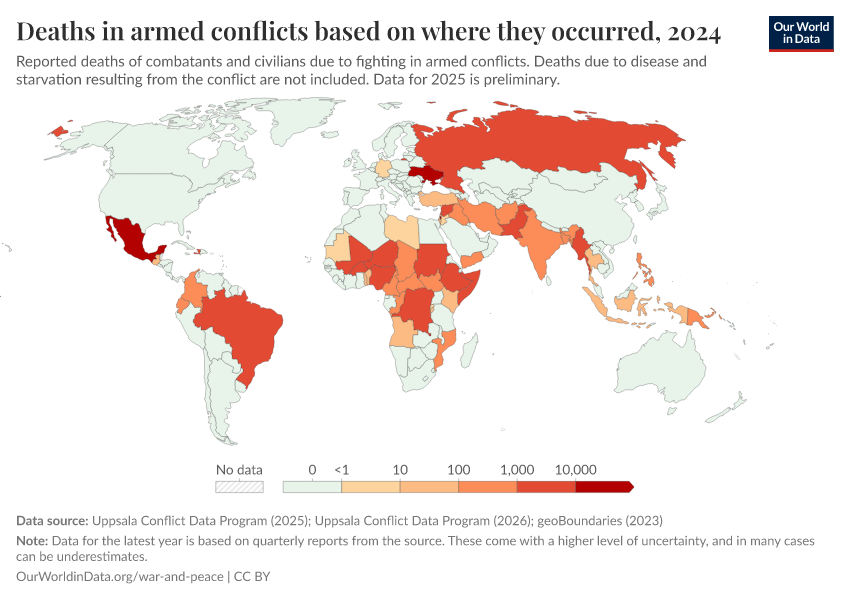 Bastian Herre, Lucas Rodés-Guirao, and Max Roser (2024) - “War and Peace” Published online at OurWorldinData.org. Retrieved from: 'https://region-dods-income-groups.owid.pages.dev/war-and-peace' [Online Resource]BibTeX citation